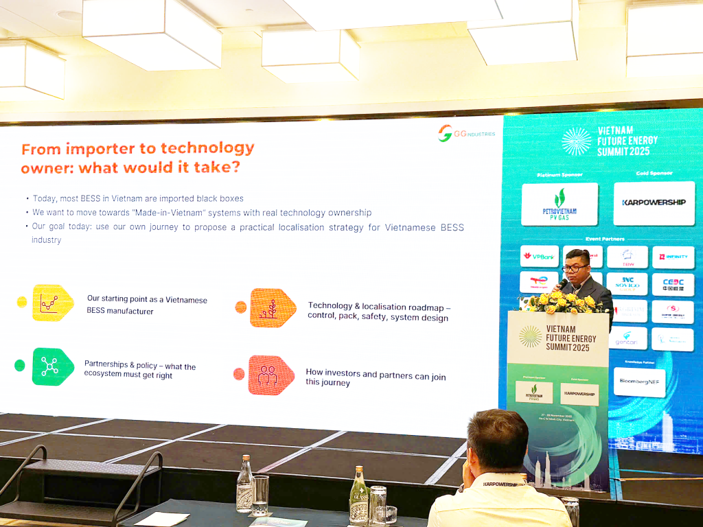 At the Vietnam Future Energy Summit 2025, Mr. Dao Hoang Duy – Deputy General Director of Sales & Marketing at GG Industries – delivered a notable presentation on the topic: “From Black-box Imports to Made-in-Vietnam BESS Platforms.”